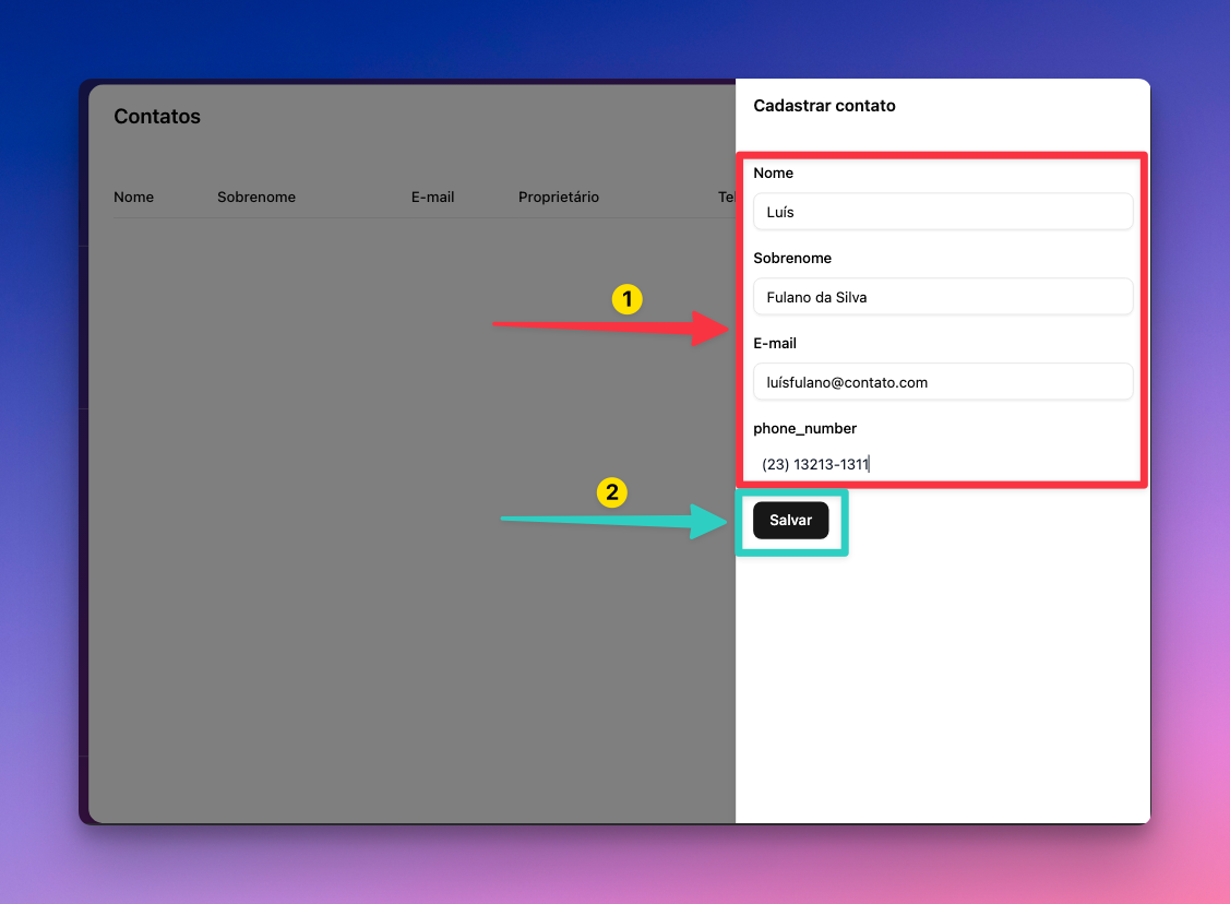 Aparecerá uma aba "Cadastrar contato", agora você colocará os dados do seu cliente: