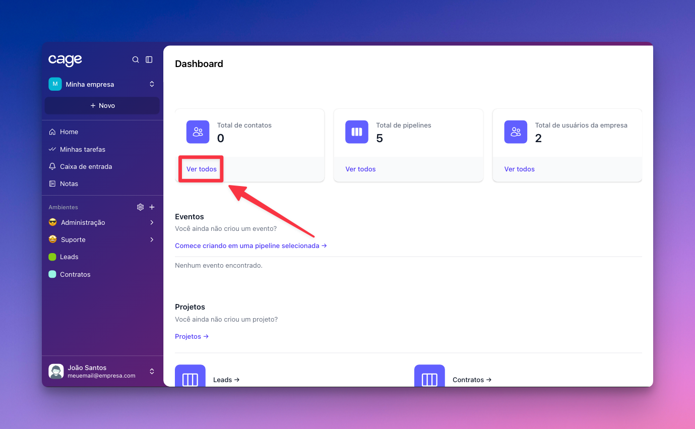 - Na página do dashboard, tem um quadro “Total de contatos” com um botão “Ver todos”, aperte ele e te direcionará para uma outra aba.